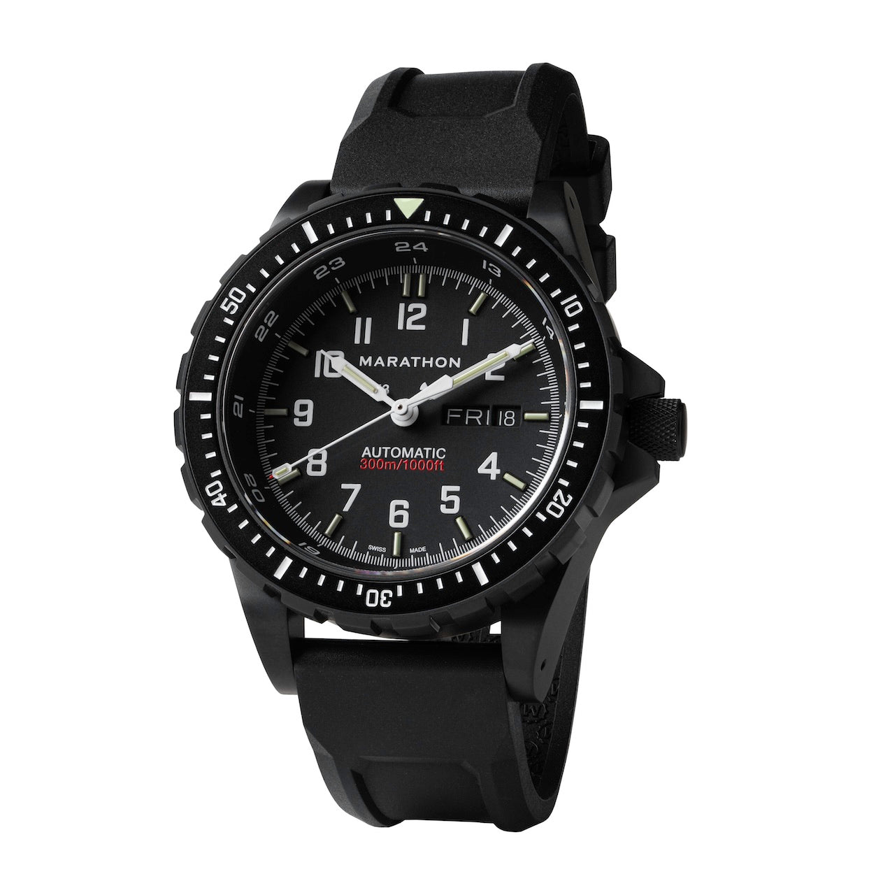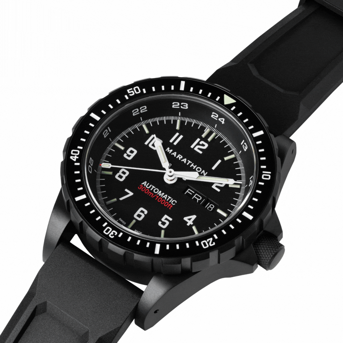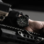 The Marathon Anthracite SAR was first issued in 2018 for stealth during tactical night missions. Hand-assembled, with a durable black anti-reflective Ion-Plating (IP) armour on its 316L Stainless Steel case and movement.